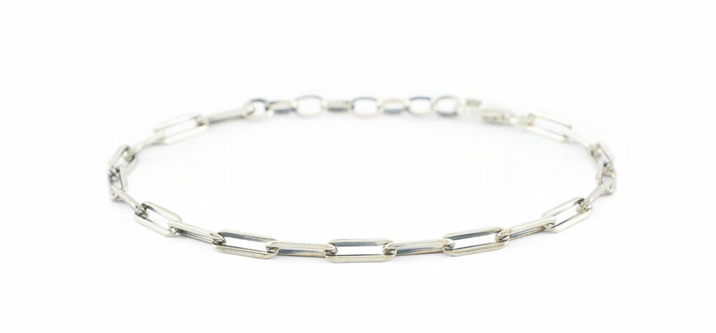 The Silver Garland Bracelet, crafted from 925 Sterling Silver, features rectangular links with an oxidised finish, a lobster clasp, and adjustable length. This classic silver bracelet will elevate every look and is also available in gold.