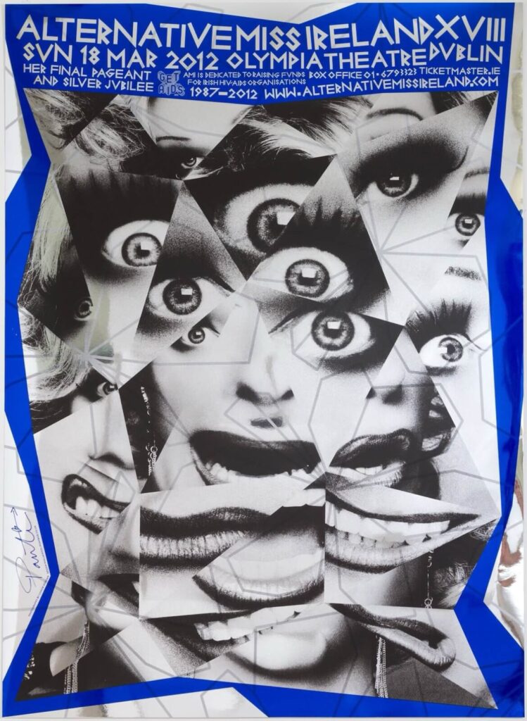A poster for the final Alternative Miss Ireland in 2012, featuring a fragmented image of drag queen Panti Bliss.