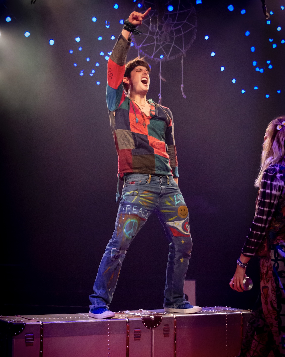 Director Dexter has hit upon the genius idea of setting a show that premiered in the early 1970s a few years earlier during the 1967 ‘Summer of Love’ when the flower power hippy movement was in full flow and Hair was causing a sensation. Thus we get a group of travelling players dropping in to tell the tale of Prince Pippin with flowers in their hair, dipping in and out of numerous characters with the clever use of props (tambourines for crowns, metal poles for guns and swords), and a few accessories.