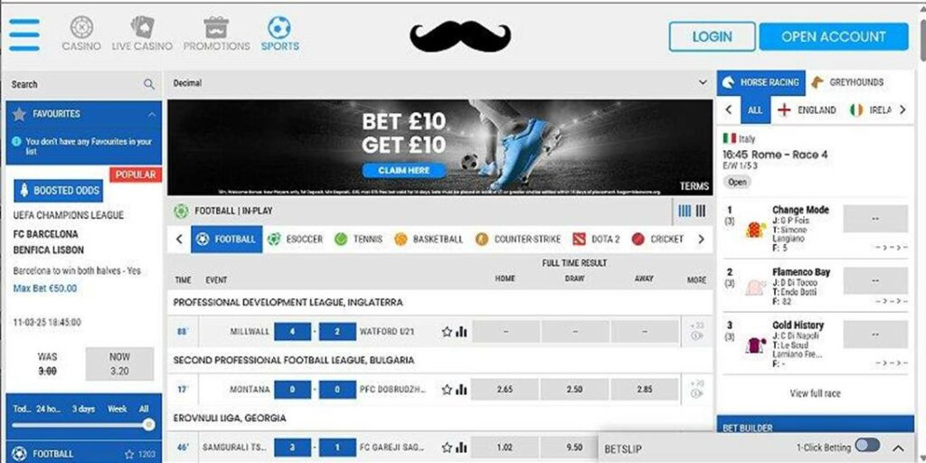 You can place a wide range of bets, including over/under, totals, and props, but perhaps glaring by its absence is the handicap bet. The “My Favourites” tab is great for speeding things up when you want to quickly find an event, league, or tournament, while horse racing and greyhounds are well-covered here.
