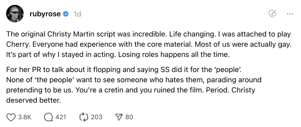 Ruby Rose has slammed Sydney Sweeney, suggesting she “hates” gay people and “ruined” the boxing film Christy, based on lesbian former professional boxer Christy Martin.