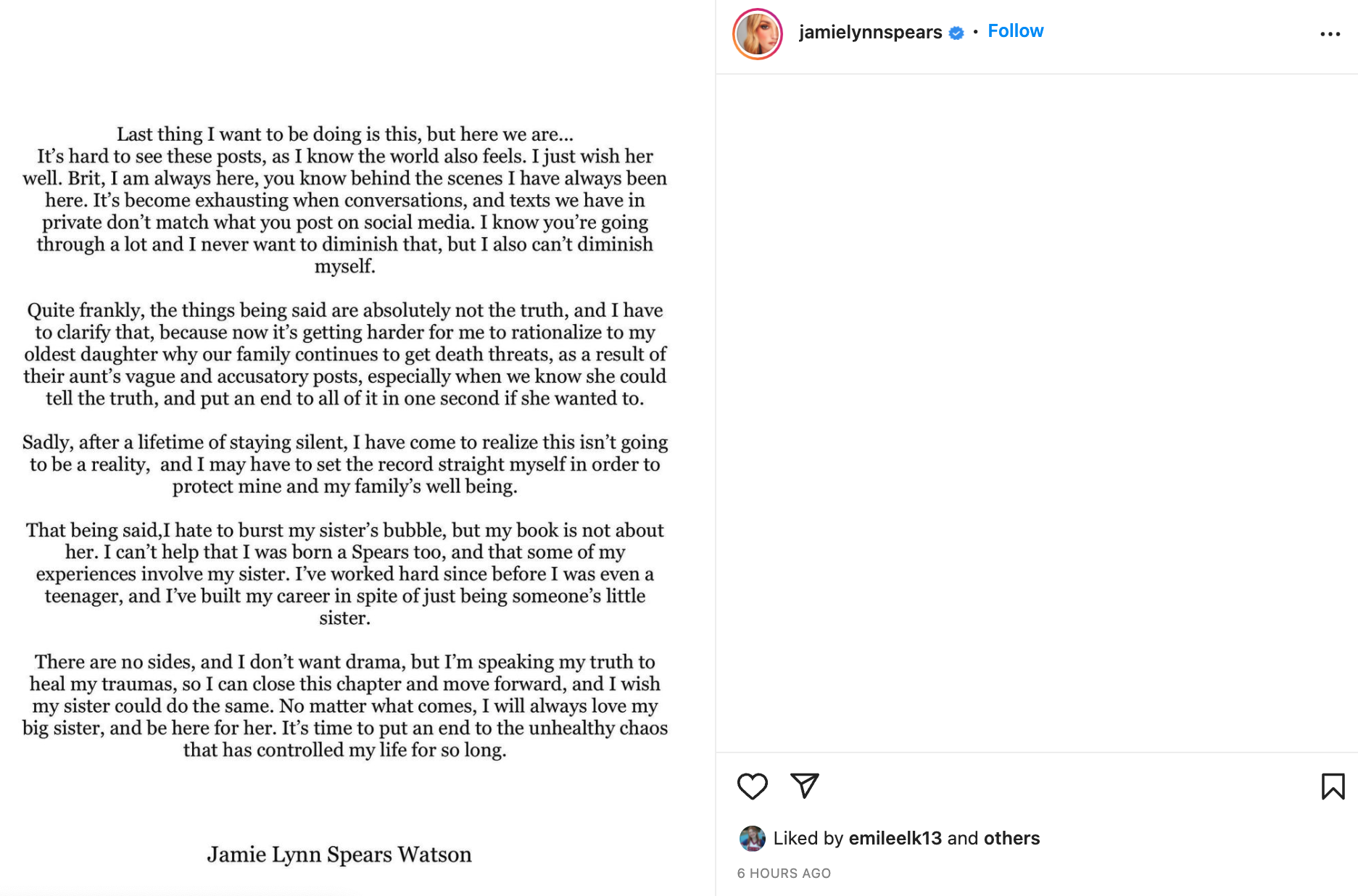 Responding to her sister’s claims in an Instagram post, Jamie Lynn addresses her sister directly. She says: “Brit, I am always here, you know behind the scenes I have always been
