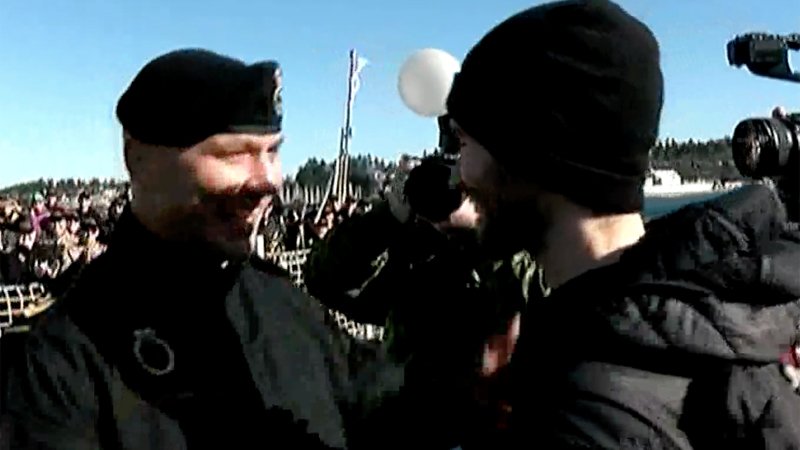 After his long term of deployment away at sea, Frances Legare made Canadian Naval history as a crowd cheered him on embracing partner Corey Vatour, reports Global News.