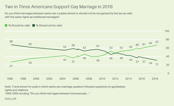 Almost three years since the US Supreme Court legalised equal marriage in all 50 states, a poll for Gallup indicates that more than two-thirds of Americans (67%) believe same-sex marriages should be legally valid.