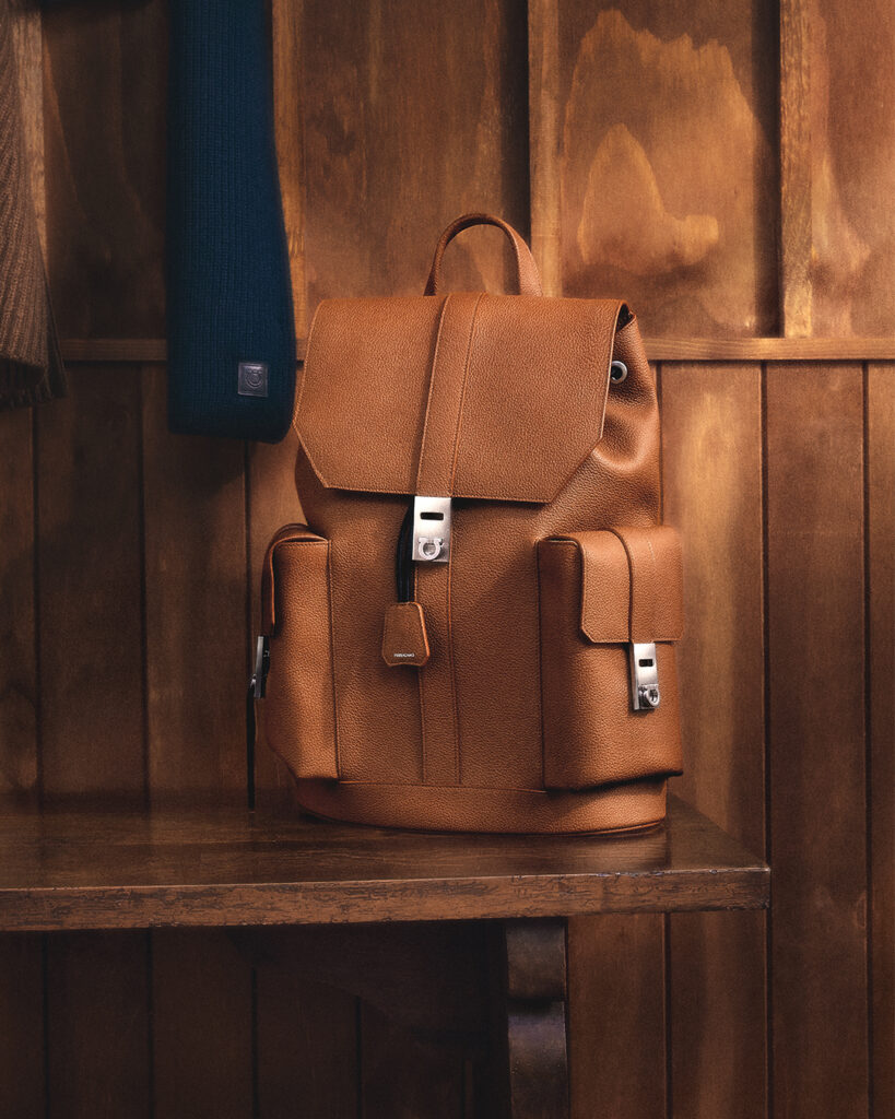 Davis’ utilitarian focus extends to bags with the Utility rucksack. The leather holdall mirrors hiking gear with external flap pockets, padded straps, and a structured silhouette built for movement. Securing your everyday essentials in place are Ferragamo’s signature Gancini clasps, adding a refined finish to the practical silhouette.