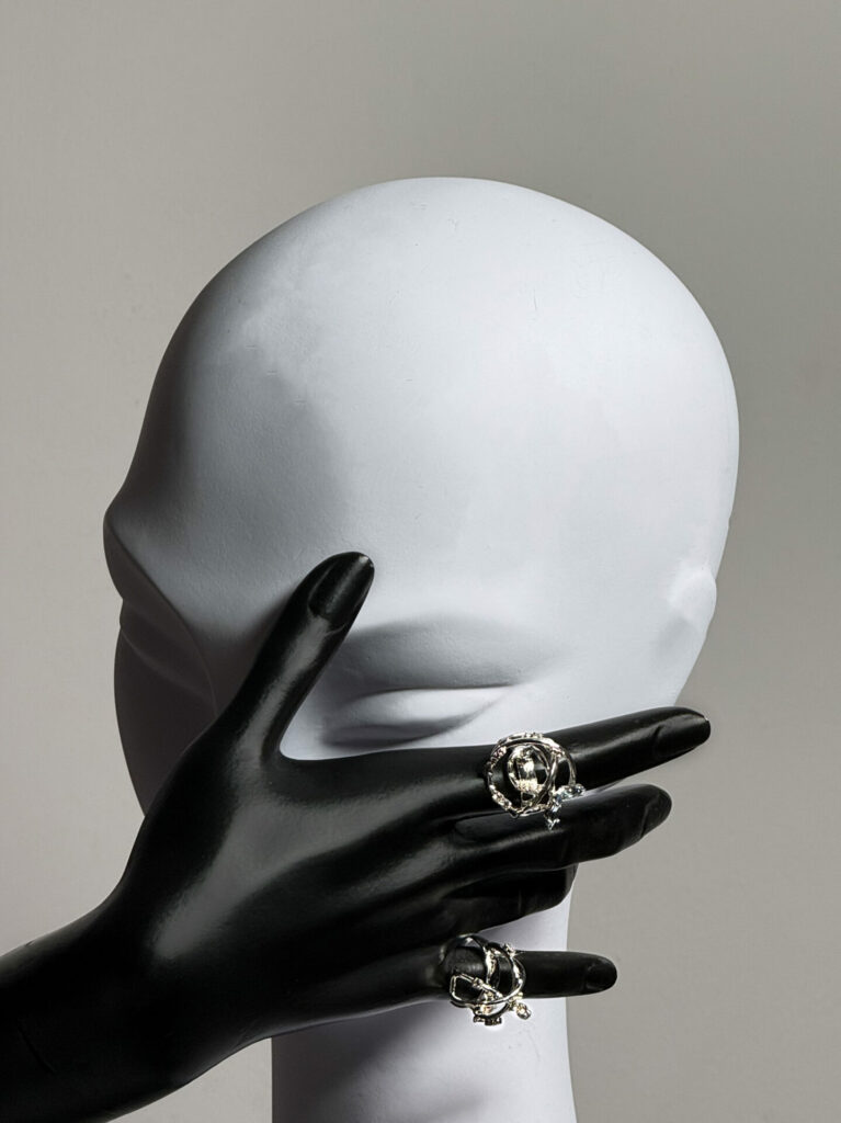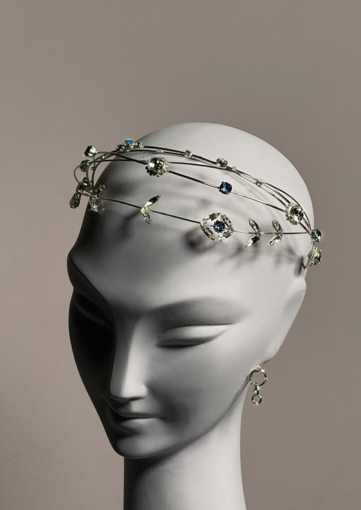 The collection features twelve pieces, including two tiaras, multiple earring styles, pendants, and earcuffs. Drawing inspiration from millinery construction, the designs incorporate references to Art Deco, the French Empire, planetary rings, and astrological symbolism. Each piece embodies elegance, and otherworldly beauty, uplifting the wearer and making a bold statement.