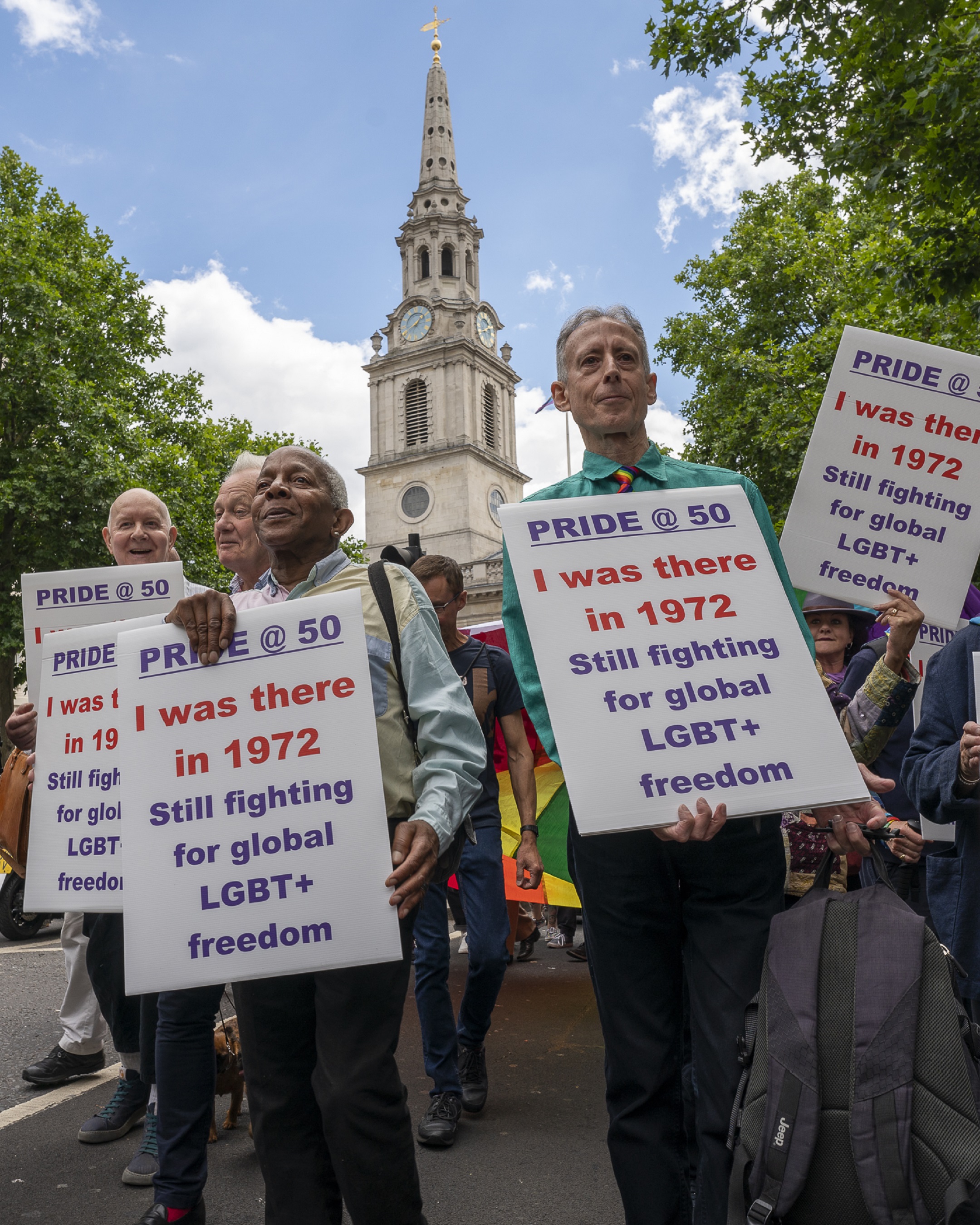 Led by veterans of the Gay Liberation Front who were there that historic day half a century ago, queer activists and grass-roots organisations retraced the route of the original march from Trafalgar Square to Hyde Park.