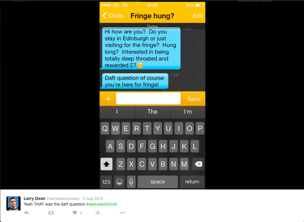 Given that I’m a comedian, I work at night, meaning my time on Grindr has paid off in other ways…